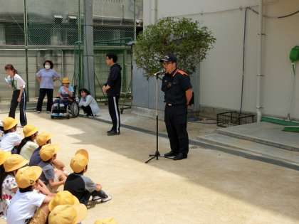東成消防署からも来ていただき避難する時の方法や、実際に火事を見つけた時は、消火器は勝手に使わず、大人に連絡することの重要性を説明していただきました。