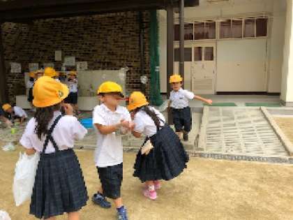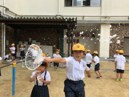 6月12日(火)1年生が生活科の学習でシャボン玉遊びと水遊びをしました。