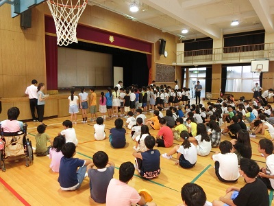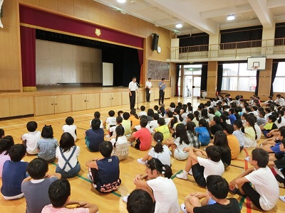 学校長の話と生活指導に関する内容の話があり、夏休み中のプール開放と図書館開放に全て参加した子どもたちの表彰も行いました。
