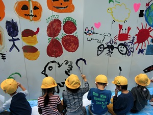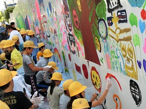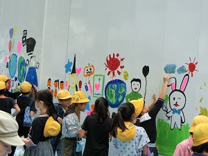 この行事は、北中道地域活動協議会が中心となり、大阪府、東成区と地域の企業団体とが協力して企画され、中央大通り沿いにある成人病センター跡地の周囲を囲むフェンスに、本校児童がペンキを使い絵を描きました。