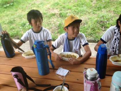 遅くなりましたが、野外炊飯で作ったカレーを食べている様子です。苦労して作ったカレーを大自然の中で食べ、きっとおいしかったことでしょう。