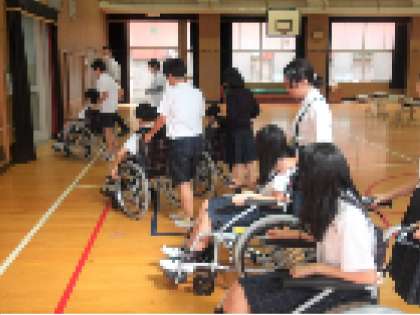 高齢者疑似体験では、特殊ゴーグルをつけることによってぼやけた視界を体感したり、手足におもりをつけることで、動きづらさや不快なだるさを感じたりすることができました。また、車いす体験では車いすを押すときに必要な思いやりを理解し、バリアフリーのためにはどうすることが必要かを考えることができました。