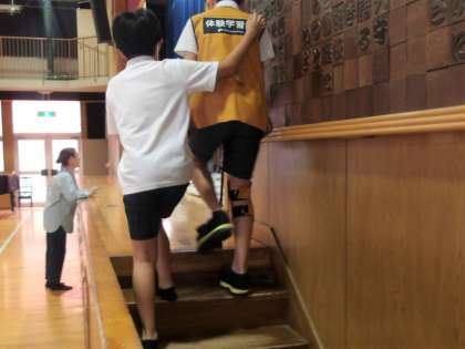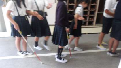 高齢者疑似体験と視覚障がいの方との交流の写真です