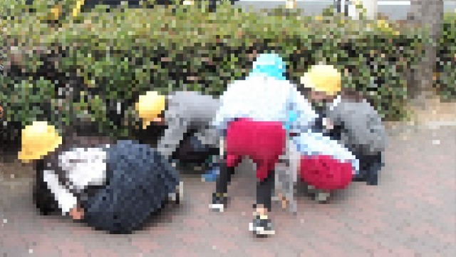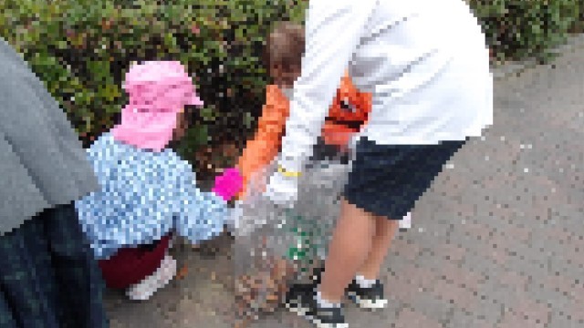 疎開道路から小学校と幼稚園の周辺を、グループに分かれて清掃を行いました。4年生の児童が園児の手を引き、やさしく声を掛けながら、ごみや落ち葉を拾い集め、ほほえましい交流もできていました。