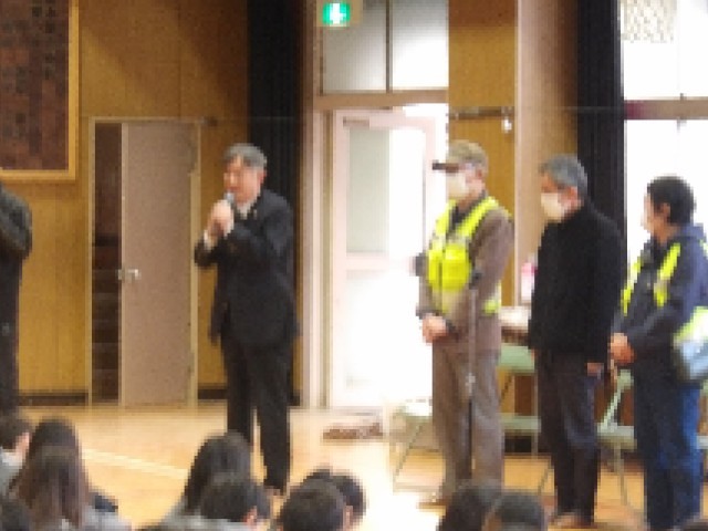 年度の最後に日頃の感謝の気持ちを伝える式として、6年生代表児童がお礼を述べ、見守り隊代表の方にお話をしていただきました。
