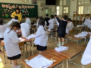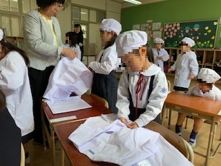まずは給食の準備からです。エプロンの着方・片づけ方、給食の準備について、みんなで学びます。