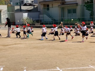 運動場をのぞくと、1年生が体育をしていました。体力テストのソフトボール投げに向けて、練習を行っていました。「上を見て、足を上げて、投げる!」先生からポイントを教えてもらって、ソフトボールを投げていました。