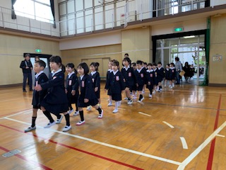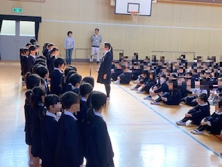 1年生が入場すると、2〜6年生は大きな拍手で迎えました。児童代表が1年生に歓迎のことばを伝え、2〜6年生で「1年生になったら」の歌のプレゼントを送りました。1年生は大きなお兄さんお姉さんに迎えられ、少し緊張したようすでしたが、たくさんの笑顔も見ることができました。