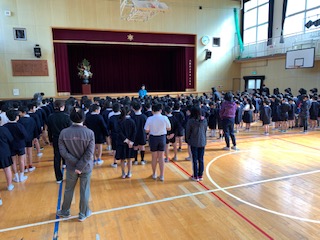 今回は初めて1〜6年生がそろっての朝会となります。あいにくの雨で、講堂での児童朝会です。