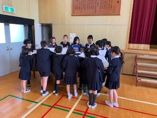 朝会が終わると高学年の子どもたちが集まています。このメンバーは各委員会の委員長で構成する「代表委員会」のメンバーです。なにかの打ち合わせをしているようです。