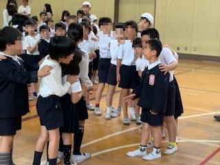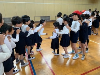 今日は全校で、じゃんけん列車をしました。背の低い低学年の子がじゃんけんに勝って、背の高い高学年の子どもたちを引き連れていました。みんな楽しそうに活動していました。
