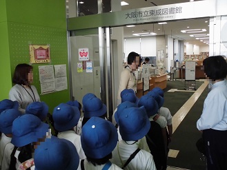 「東成図書館に行ったことある人は?」と聞くと、たくさんの手があがり、びっくりしました。行ったことのある子も多いですが、まだまだ知らないこともたくさんあります。図書館職員の方に、たくさんお話を聞いたり、実際に触れたりして、学んできました。