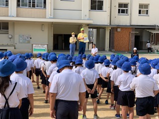 児童朝会で、中本小学校区を担当していただいているあんパトの職員の方の紹介と、登下校で気をつけてほしいことをお話いただきました。車のランプは青色です。この車で下校時間など見回りも行っています。