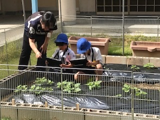 2年生は生活科でさつまいもを育てています。苗から育て、成長のようすを観察しています。紙に描いて成長のようすを残していますが、タブレット端末を使い、写真でも成長のようすを残しています。