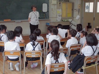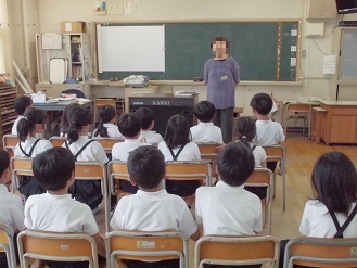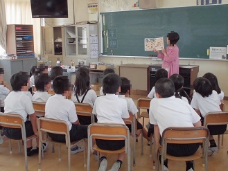 東成図書館でも活躍されている、パンジーお話会に来校いただき、お話会をしていただきました。中本小学校では学期に1度来校いただいています。