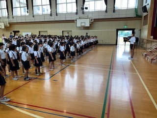 明日の終業式のあと、いつも登下校でお世話になっている、見守り隊の方々へ感謝の気持ちを歌で伝える時間があり、そのための練習をしていました。