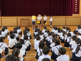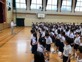 校長先生からのお話、校歌斉唱、3年生代表から1学期の反省と夏休みの目標の発表、夏休みの過ごし方のお話をしました。