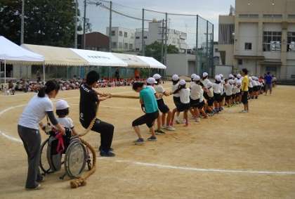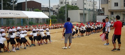先生も入ります。この競技は、得点には入れません。みんなで綱引きを楽しみます。子どもたちは、力を合わせて頑張ります。運動会当日は、赤白どちらに勝利の女神は微笑むのでしょうか。