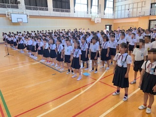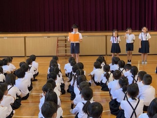 2学期がスタート始まりました。全校そろって、始業式を行いました。今回は4年生が代表して、夏休みの反省や2学期の目標について発表しました。