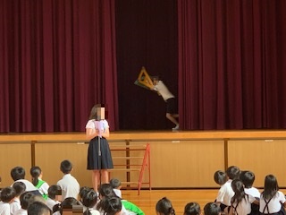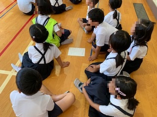 幕のすき間に一瞬見える物が何かを当てます。なかよし班の友だちと「あれや!」と相談しながら、集会委員会が用意した解答用紙にリーダーが答えを書いていました。