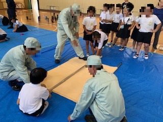 簡易タンカーづくりをしました。棒2本と布(毛布)があると、タンカーになります。動けない人やけがをした人をこれで運ぶことができます。低学年の子どもたちには少し難しいですが、毎年行っている高学年になると、とても手早く組み立て、人を運ぶことができていました。