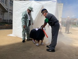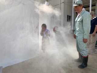 火災が起こった場合、前が見えません。どんな状況になるのか、安全に配慮されたものですが、経験したことがることで、自分の命を守る手立てとなれば、と考えています。
