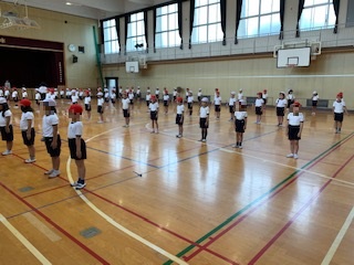 今日はあいにくの雨です。講堂で1・2年生が運動会の練習を進めていました。
