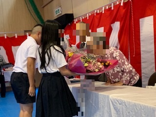 敬老の日の前日に、中本地域のおじいちゃんおばあちゃんが集まり、長寿をお祝いする「敬老のつどい」が行われました。中本小学校から児童代表のあいさつや花束を渡す役割を5・6年生の代表が行いました。また、全校でしおりを作り、おじいちゃんおばあちゃんにプレゼントしました。