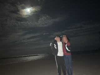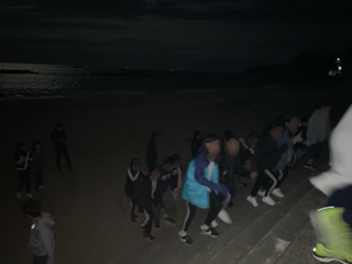 地引網は中止となり、残念でしたが、夜には星空を観察しに浜へ下りました。月が明るく、星空…とまではいきませんでしたが、月明かりに照らされて輝く、とてもきれいな海を見ることができました。ステキな集合写真も撮れました!