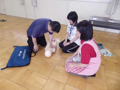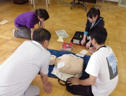 5月31日(金)の放課後に、胸骨圧迫(※心臓マッサージ)の仕方や、AED(自動体外式除細動器)の使い方など救急救命訓練を受けました。本校では、毎年、プール学習が始まる前に、訓練を実施しています。