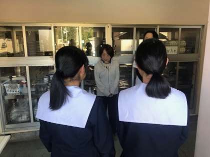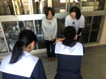 2名の生徒さんが給食室で、「いつもおいしい給食をありがとうございます」と調理員さんへ感謝の言葉と保健委員会で作成された贈り物を届けてくれました。