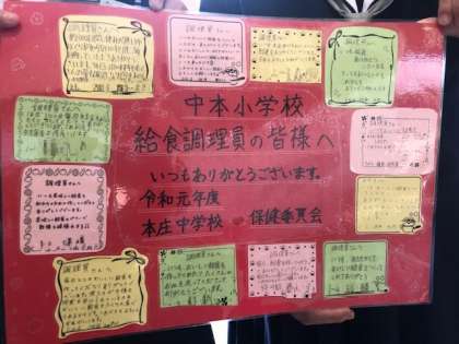 本庄中学校保健委員会の生徒さんから、給食調理員さんへ感謝の贈り物をいただきました。