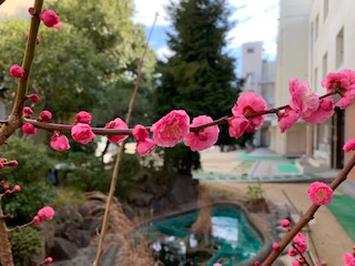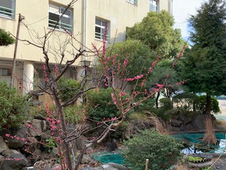小学校内の梅がきれいに花をつけています。少しずつ春が近づいています。