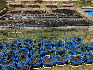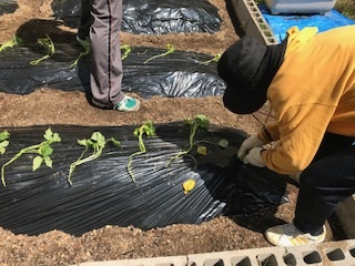 ・野菜のなえをうえています。「さつまいも・ミニトマト・ピーマン・なす・オクラ」の花の色をしらべてみる。図鑑やインターネット(NHK for Schoolなど)をつかってみてね。