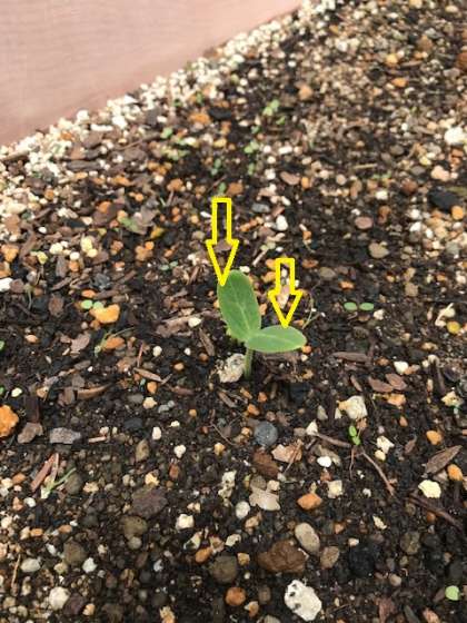 さて、一つ問題です。写真のように芽が出ることを「発芽(はつが)」と言いますが、ひょうたんは発芽で葉が2枚出ています。この小さな葉を何と言うでしょうか?