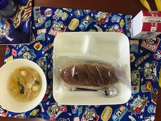 今日のメニューは「黒糖パン・牛乳・五目汁」でした。メニュー的に残食が多いかもと思っていましたが、ほぼ残食なしとのこと。