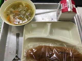 今日の給食は「黒糖パン・牛乳・豚肉とキャベツのスープ」でした。