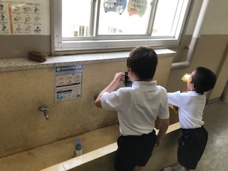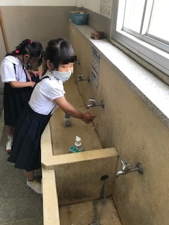 給食後、1年生が手洗い場へ。コップを使い、食後のうがい。しっかりできています。