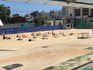 子どもたちが50mを走る前に、必死に柔軟運動をしていました。