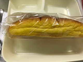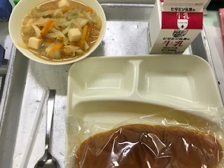 今日の給食は「パンプキンパン・牛乳・みそ汁」です。