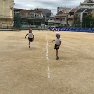 3年生が、50m走にチャレンジ。けがをしないように、徐々に運動量を上げながら、タイム計測。