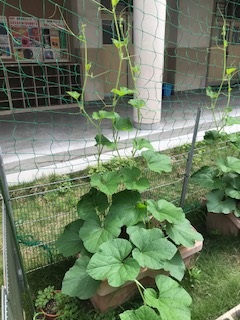 ひと月前にまだ芽生えてすぐだった4年生のひょうたんが、この1か月でぐんぐん育ちました。比べてみるとすごい差です。