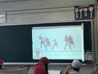 4年生の教室では、スクリーンに映し出された映像を見ながら、子ども達がダンスを踊っていました。これもICTを活用した工夫ですね。