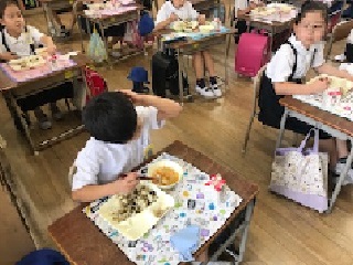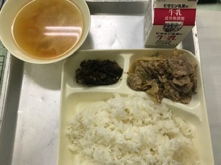 今日の給食(昨日の給食になりますが・・・)は「ごはん・牛乳・豚肉のごまみそ焼き・すまし汁・のりのつくだ煮」でした。