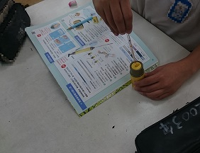 植物の葉から出入りする期待を調べるため、まずは使い方を学びました。検知菅は気体採取の前に両端を折り取ります。ここが少し難しかったようです。