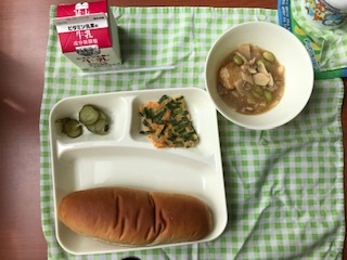 昨日の給食は「黒糖パン・牛乳・豚肉と野菜の煮物・チヂミ・きゅうりの甘酢あえ」でした。