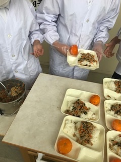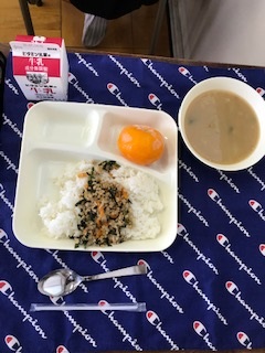 3日(金)の給食は「ごはん・牛乳・豚ミンチとニラのそぼろ丼・オクラのみそ汁・みかん(冷)」でした。