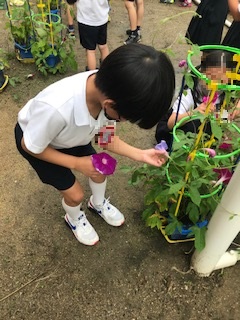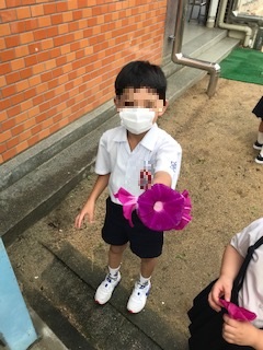 昨日、1年生が自分たちで育てているあさがおの鉢までやってきて、それぞれの鉢に咲いているあさがおの花を摘んでいました。