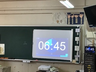 テスト時間を知らせたり、百ます計算の時間を測ったり、といったタイマーはICTを活用しています。もちろん体育のタイム計測等は今でもストップウォッチを使っていますが、教室での学習では画像のようにスクリーン等を通して分かりやすくしています。