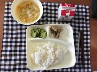 10日(金)の給食は、「ご飯・牛乳・豚肉の香味あげ・すまし汁・あっさりきゅうり」でした。
